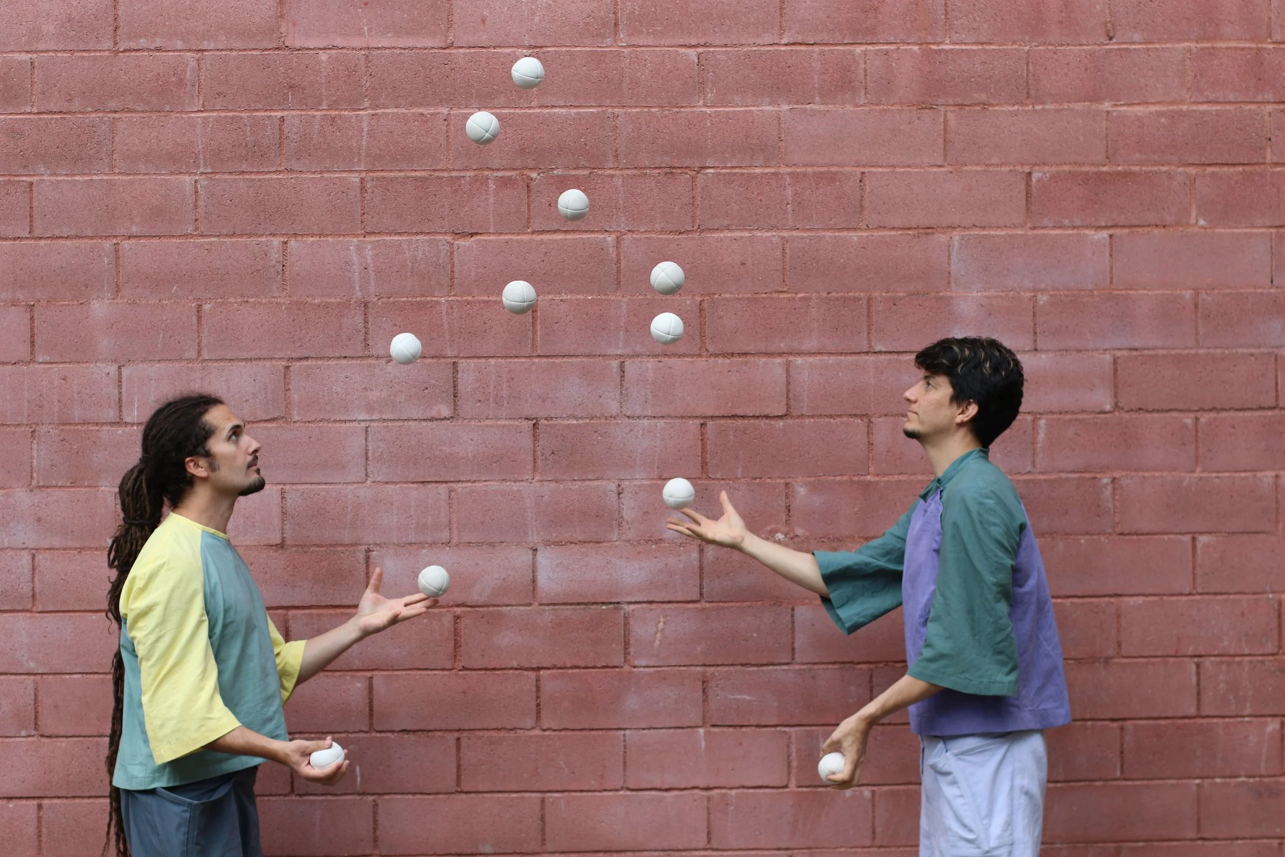 When we look at contemporary juggling shows, the tendency to prioritize the expressiveness of the piece means that the number of objects and the level of juggling technique is compromised, as if one is at a disadvantage to the other. Juggling with a large number of objects one of the main focuses of our work, it is our main language as artists and we believe in its intrinsic poetic potential. We like to combine juggling with principles of choreography and music, while maximizing the number of balls.